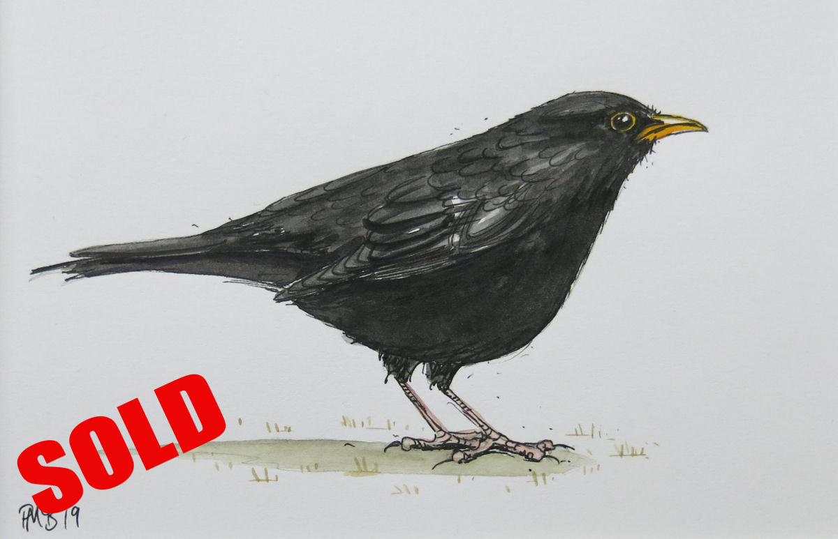 This lovely little painting is of a beautiful blackbird. I often have many busy blackbirds hopping around on my lawn. This one has been