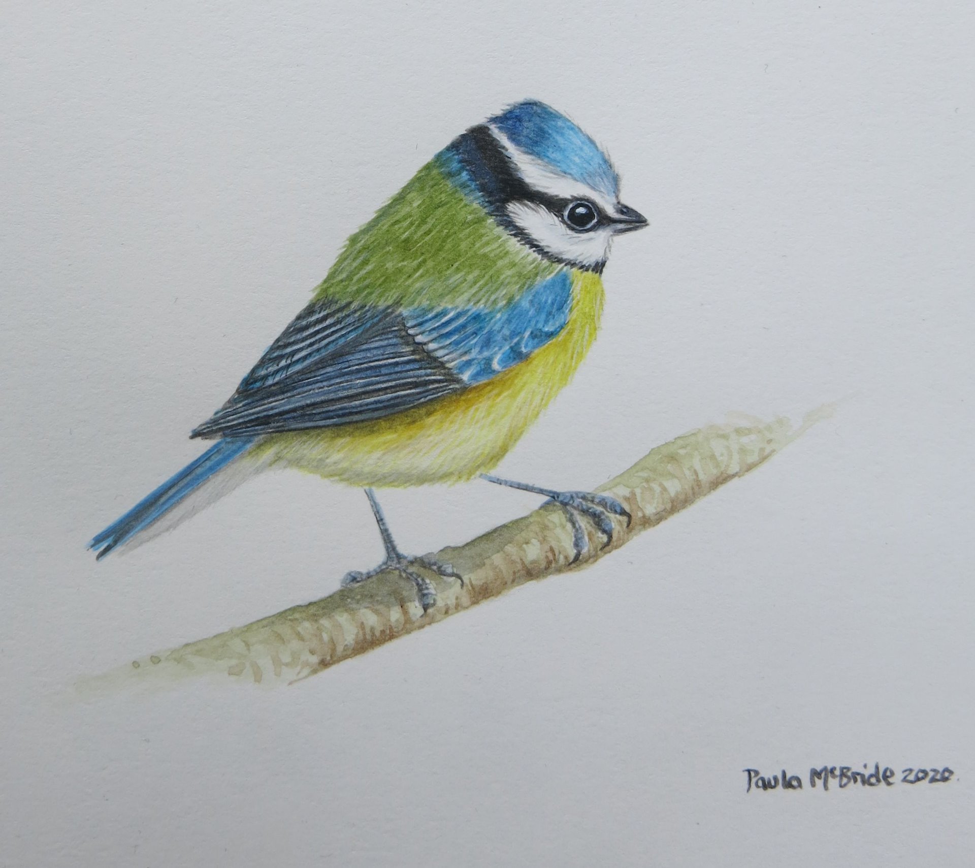 detailed little painting is of a Blue tit. These sweet little birds are a very common garden bird, but there colours and antics on the bird feeders make them a popular favourite. This one I have