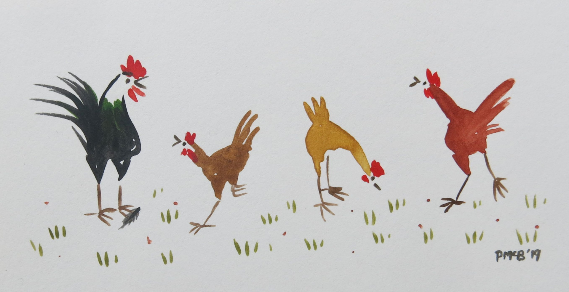 painted quickly in watercolours, then little details of beaks and feet are added, giving a comical snapshot of chicken life.