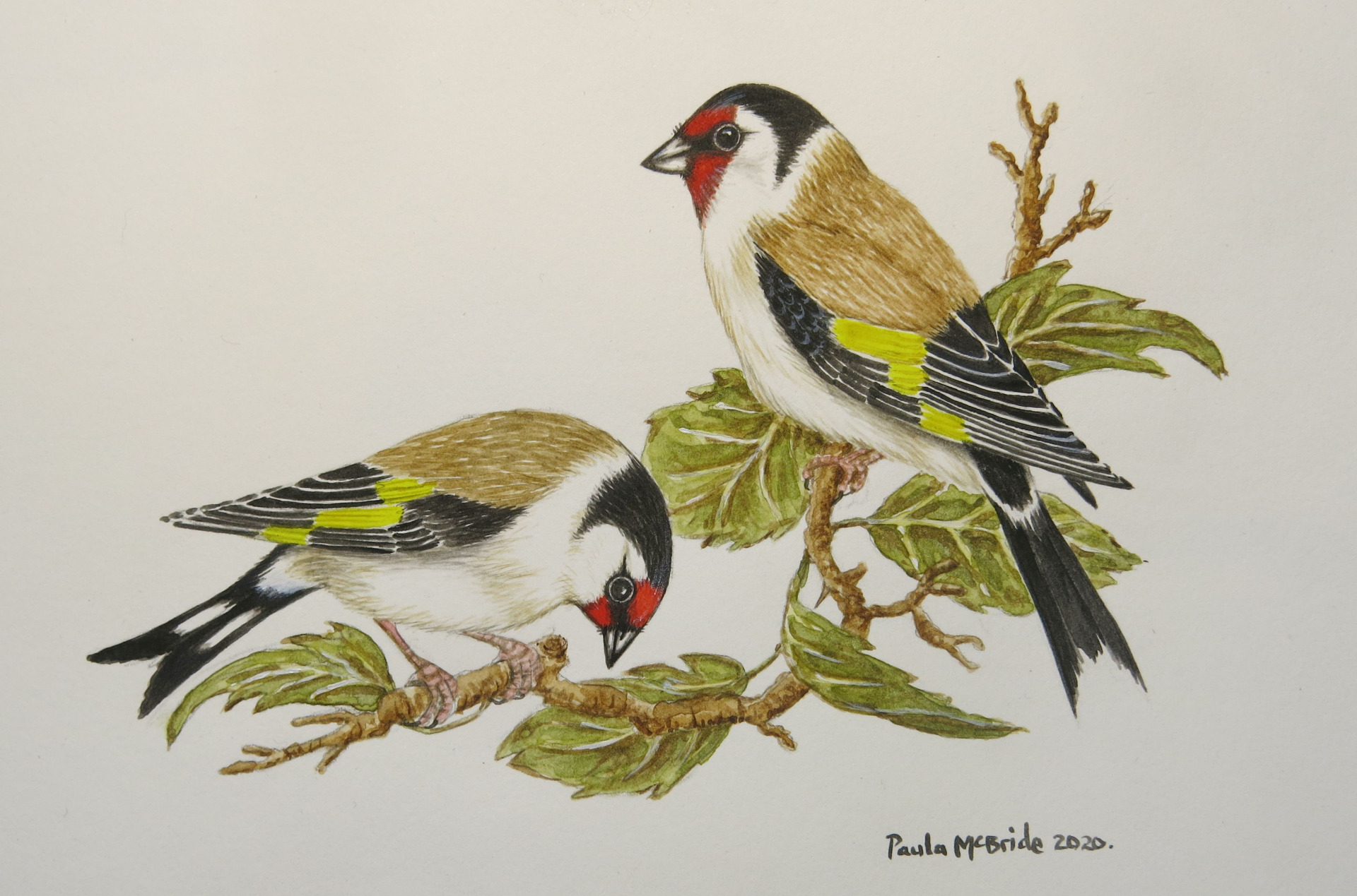 This detailed little painting is of two goldfinches. I love the name of a group of goldfinches - a 'Charm of Goldfinches'. These I have