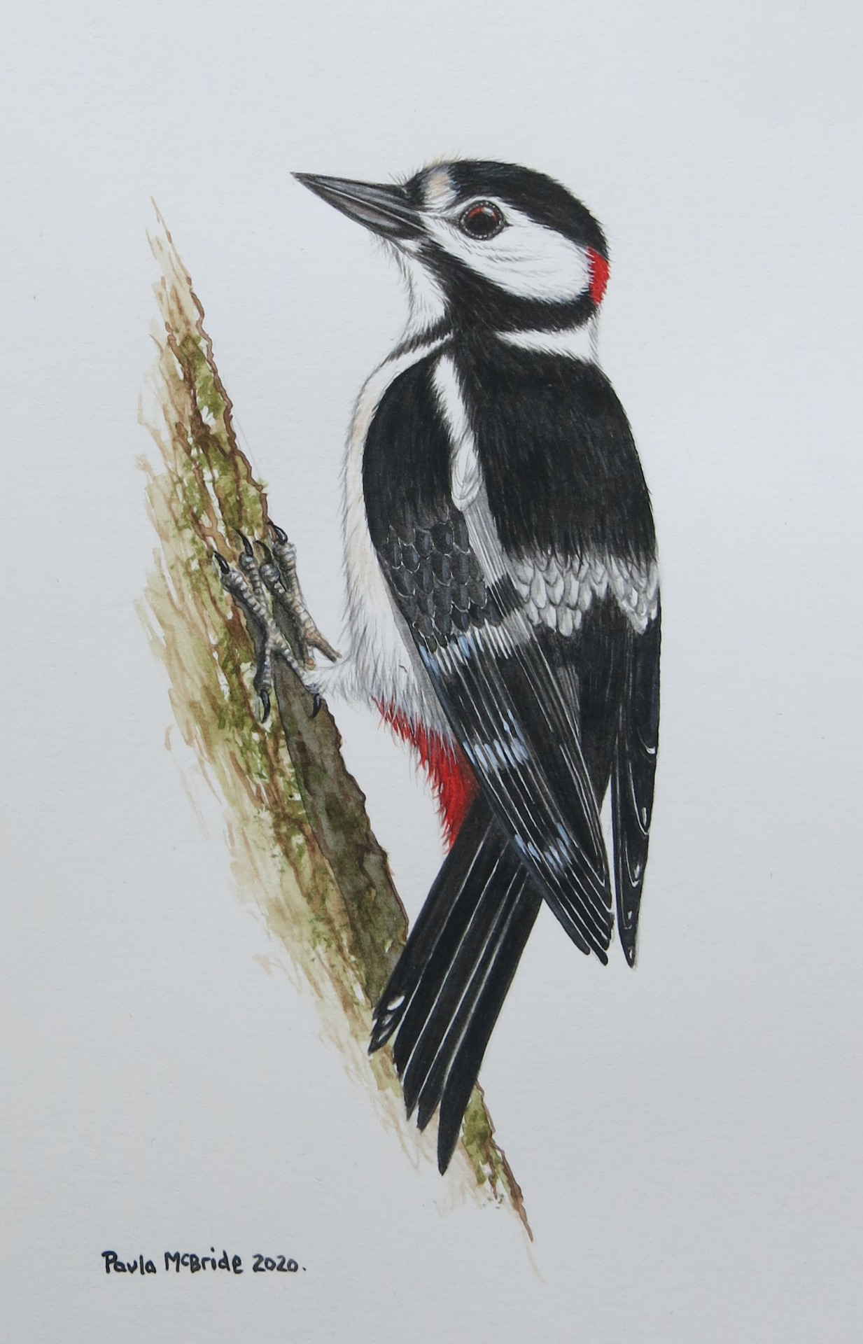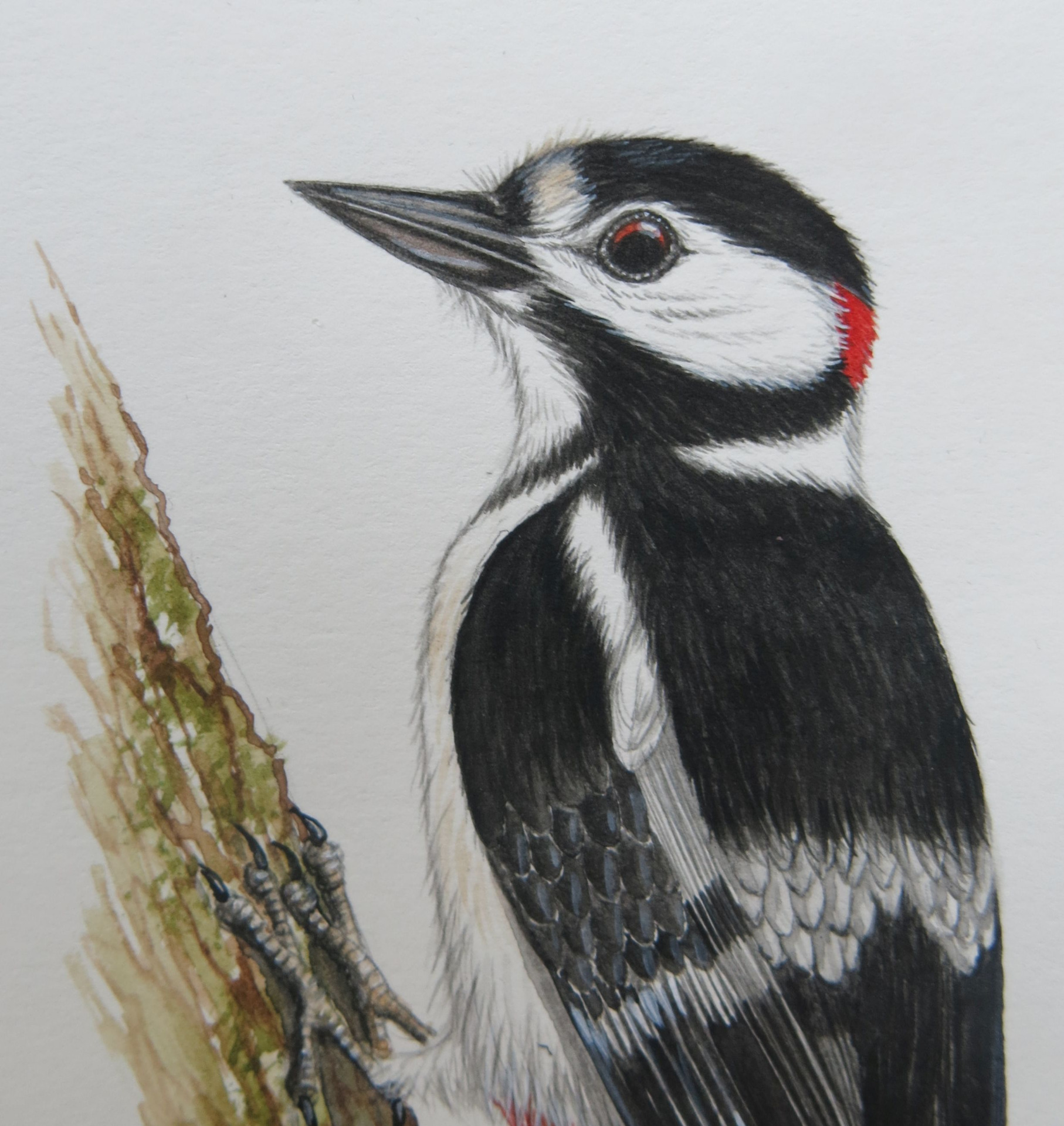This detailed little painting is of a great spotted woodpecker. Not often seen, but heard tapping in the treetops! This one I have