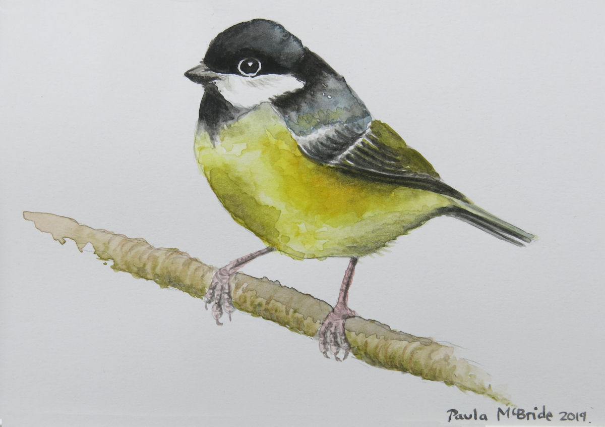 This lovely painting is of a cute little great-tit. I have many in my garden who are often seen on the bird feeder. I have