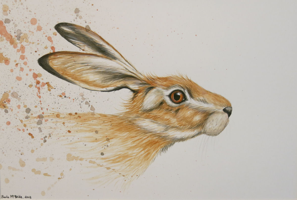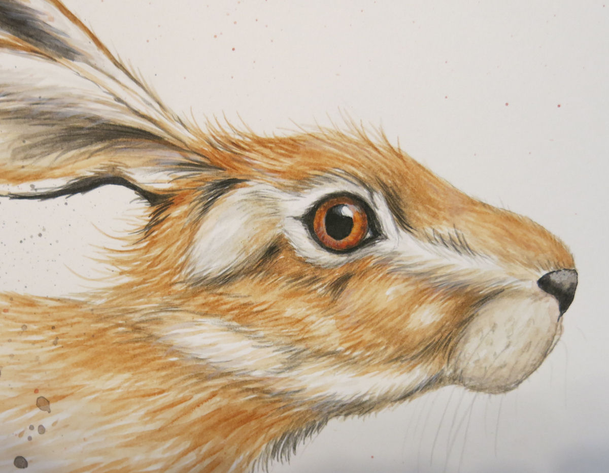 Painted partly in a loose style, then with some areas of fine detail, there is an element of speed to this hare's movement. He has been