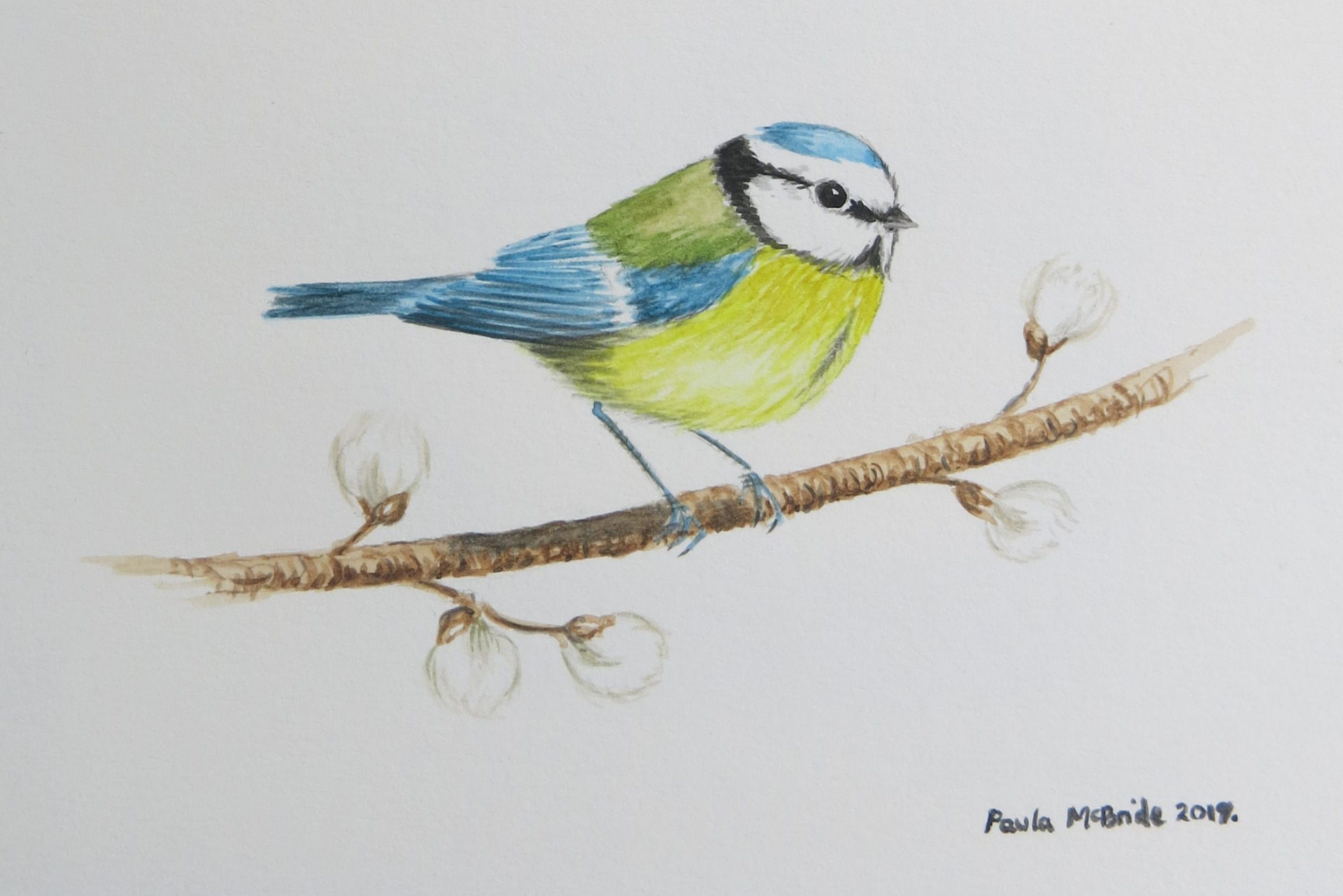 This dear little painting is of a blue-tit. My garden is full of them, they flock together in my large willow tree. I have