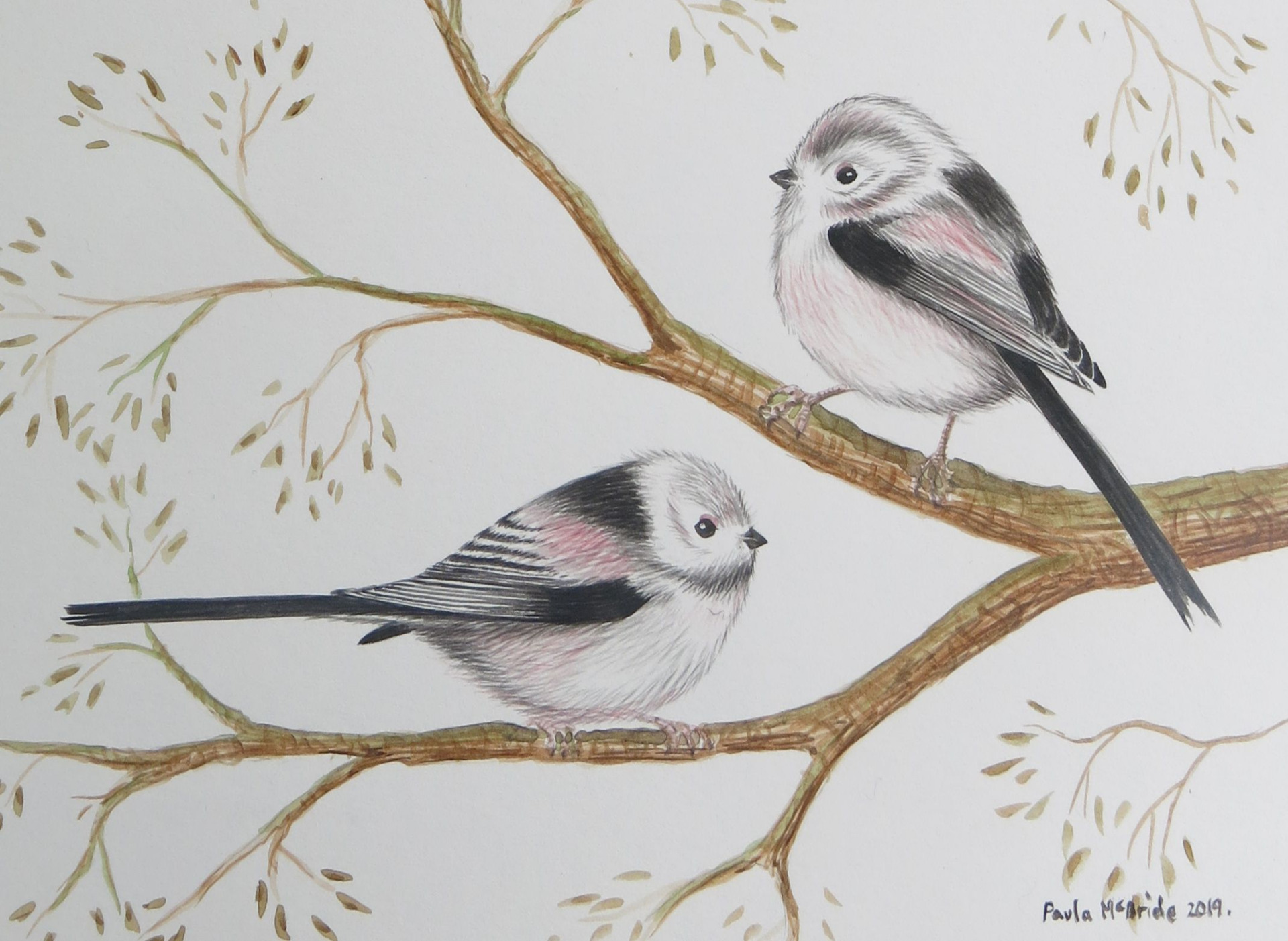 This cute little painting is of two longtailed tits. Mostly seen in family groups, they are very sweet little birds. These I have