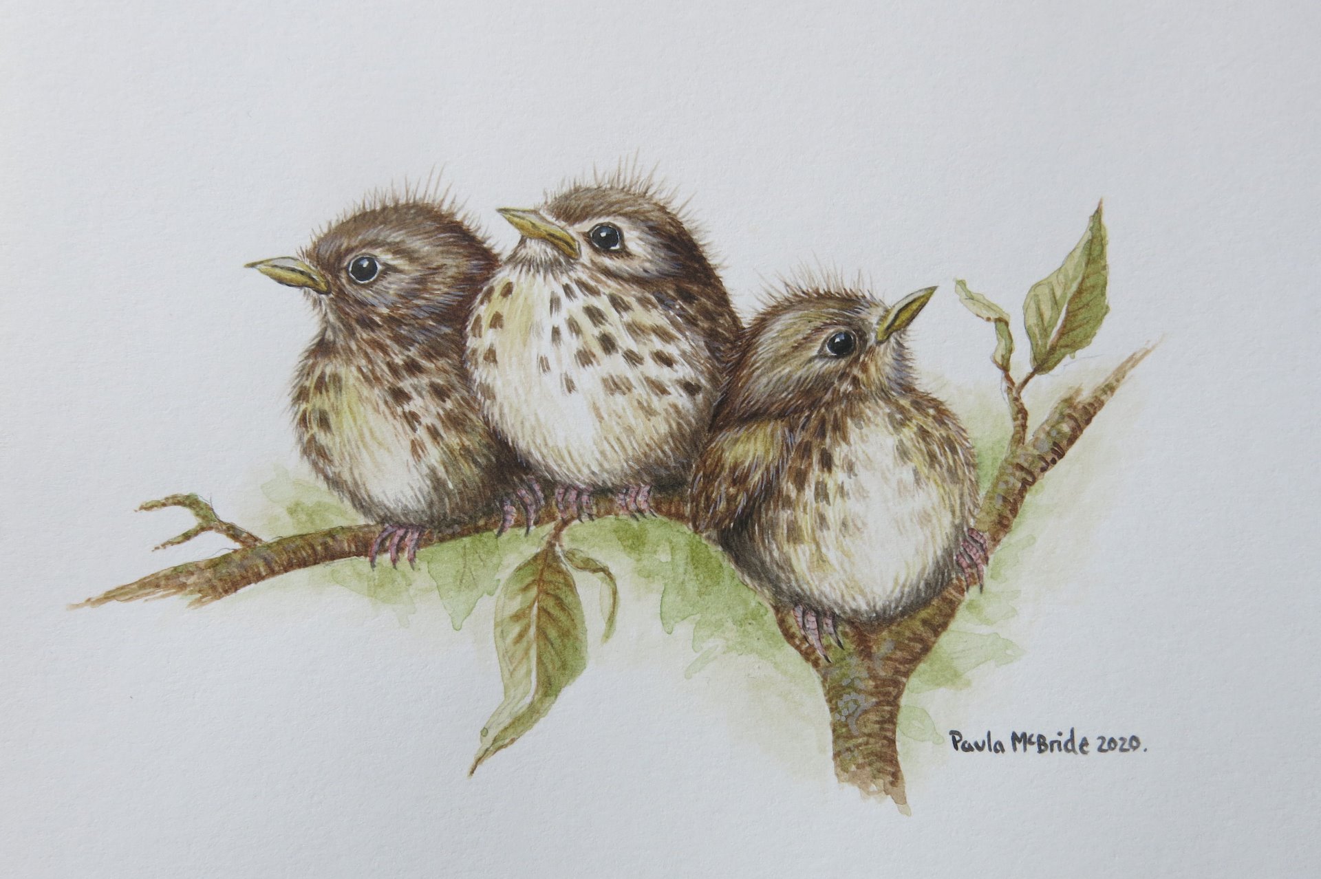 This detailed little painting is of three robin fledglings. Plump and fluffy, they are snuggled together on their branch. Cute! I have painted them in watercolours, by layering a mixture of soft washes then adding lots of fine strokes so this painting is quite detailed.