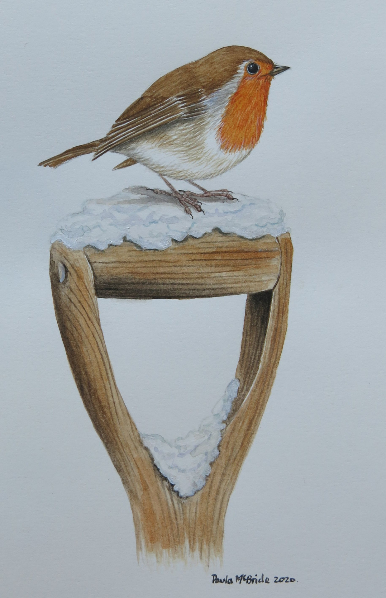 This cute little painting is of a robin 'helping' in the garden! He has been