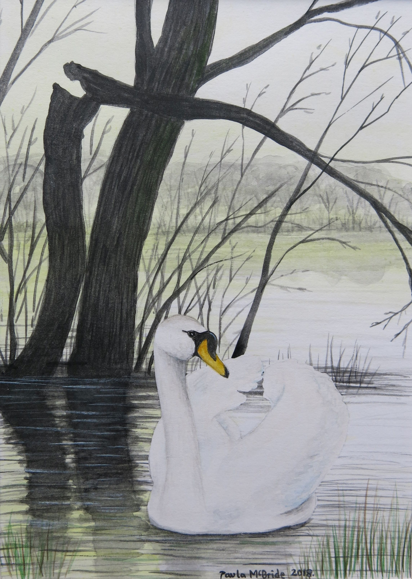 washes and building up the background. By doing this I was able to leave the white paper to show up the swan, which in turn was given some subtle details and shading to make him come alive.
